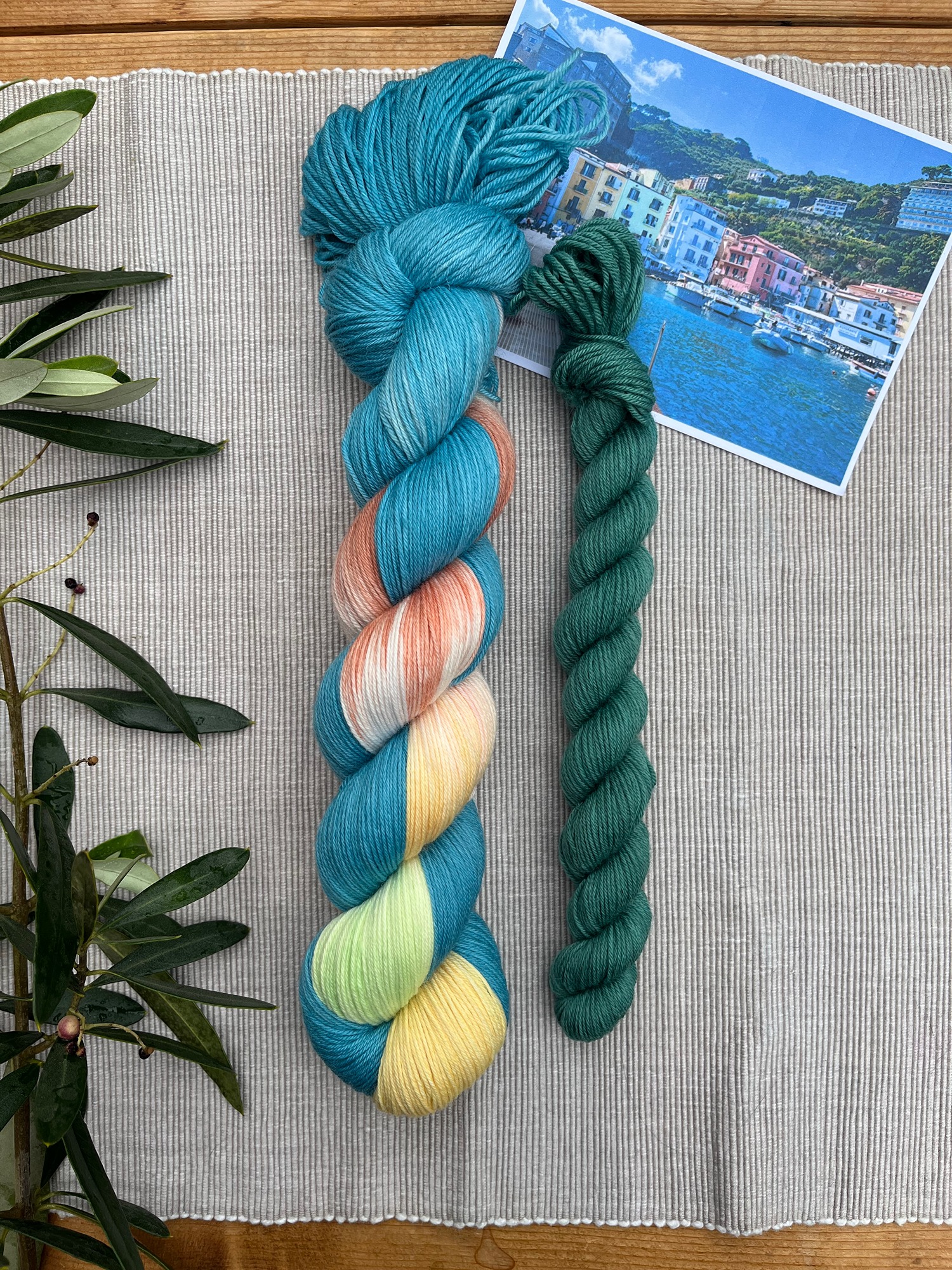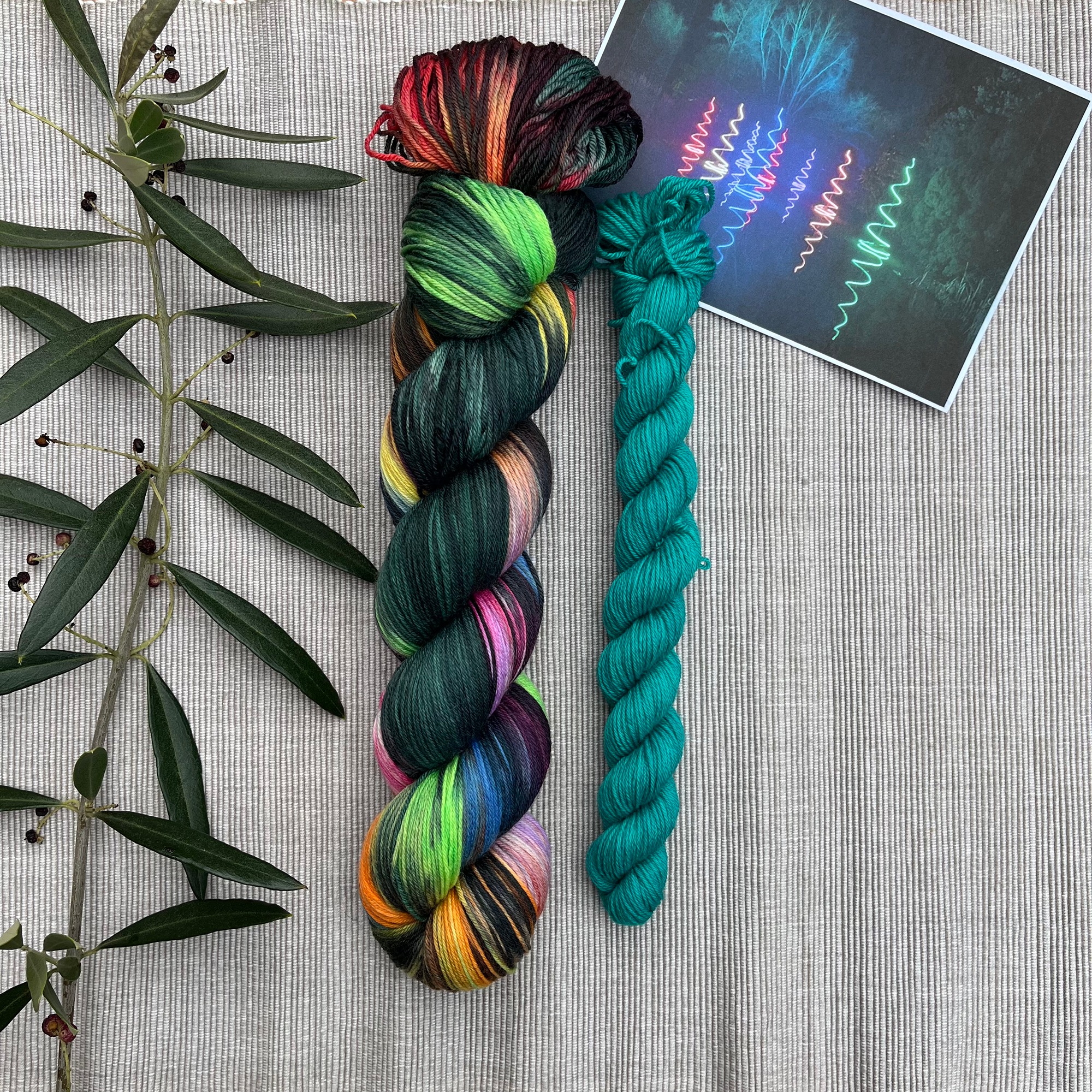 Sign up below to receive a 100g / 425m skein of sock yarn and a contrasting 20g / 85m mini-skien. The mini-skein will be dyed in a colour to compliment the full skein.