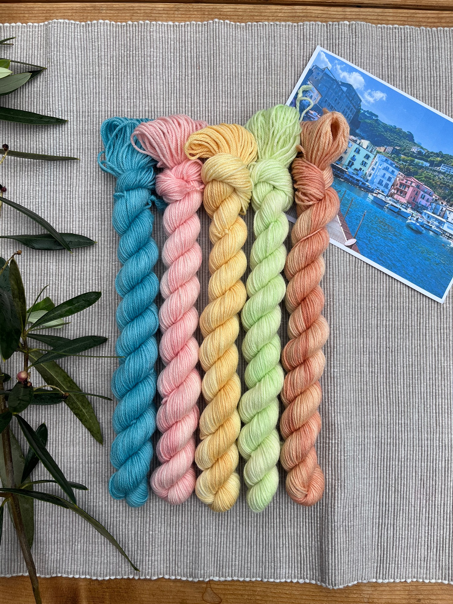 Sign up below to receive 5 x 20g / 85 mini-skeins each month. The set of mini-skeins will either be dyed in a fade or will be a selection of colours based on the monthly photo.